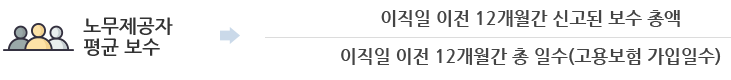 평균보수 = 이직일 이전 12개월간 신고된 보수 총액 ÷ 이직일 이전 12개월간 총 일수(고용보험 가입일수)